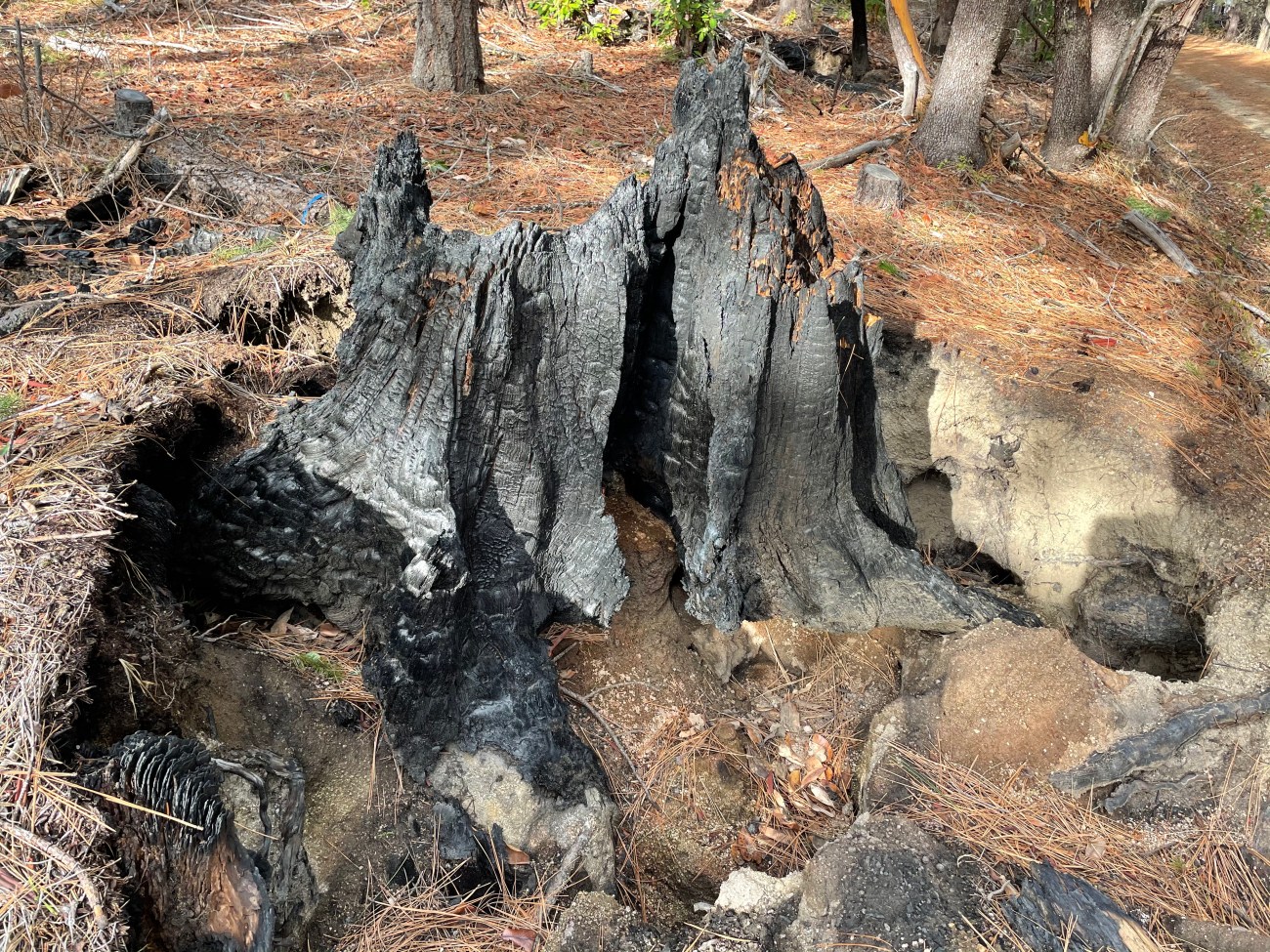 This is an intentional act. Fuel reduction crews are supervised by managers in direct contact with Forest Service staff. Forest Service staff review areas after fuel reduction work is completed. It is additional work to put out a fire of an old growth tree stump’s roots in the ground.