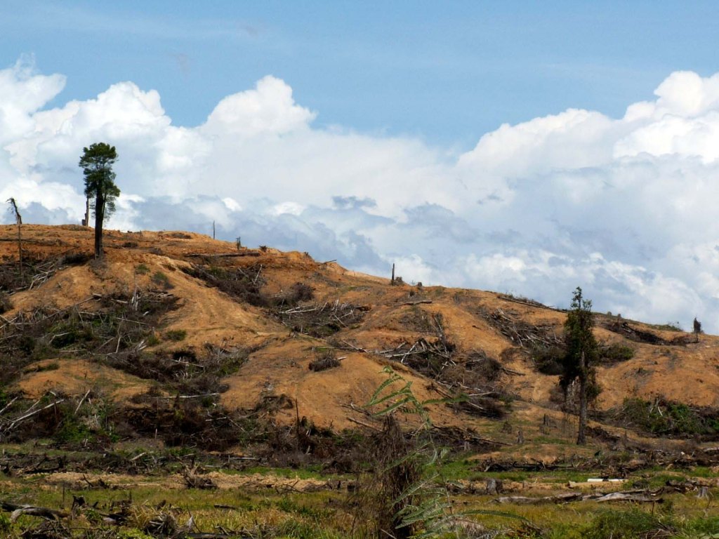 Land cleared of tropical rainforest for establishment of oil palm plantation in Sabah, Malaysian Borneo, Wikimedia.