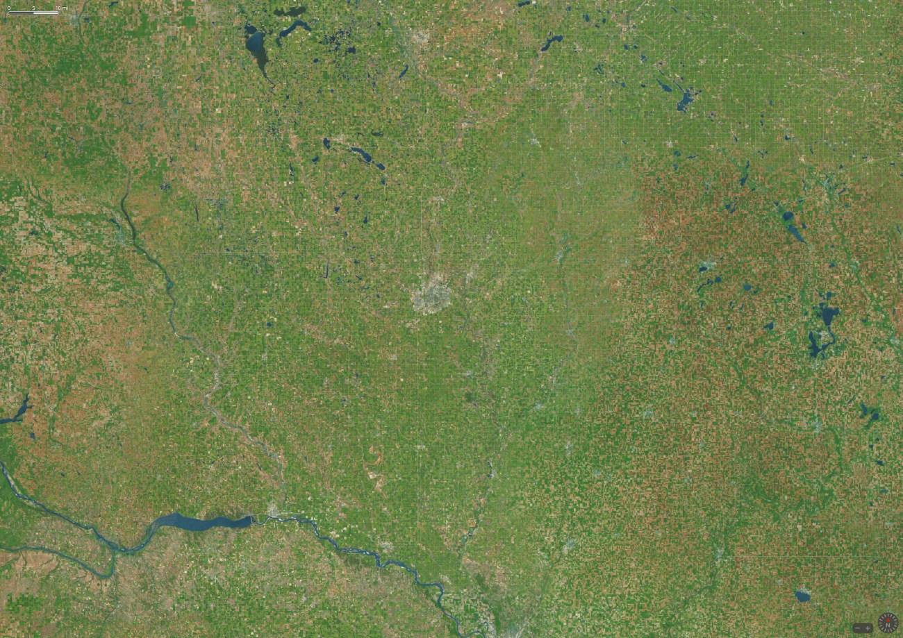 A picture is worth a thousand words. We see several things happening in the photo above: 1. Earth’s natural biodiversity is destroyed. Almost everything you see is mostly a handful of corn, soybean, or other crops. 2. Rivers are blocked. Wild fisheries and the flow up nutrients upstream are dead. 3. Crustacean of Earth’s surface by urban landscapes. 4. Radially depleting aquifers from over-irrigation. 5. Giant heat radiation causing global warming as bear topsoil is exposed to sunlight. 6. Topsoil depletion. Fertile soil is gone from a third of midwestern farm landscapes.[3] 7. Oxygen reduction during winter months because of removal of perennial forbs prairies.